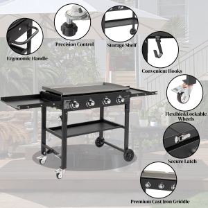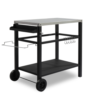 Outdoor Grill Cart Three-Shelf Grill Table, Movable BBQ Trolley Food Prep Cart with Two Wheels & Hooks, Black